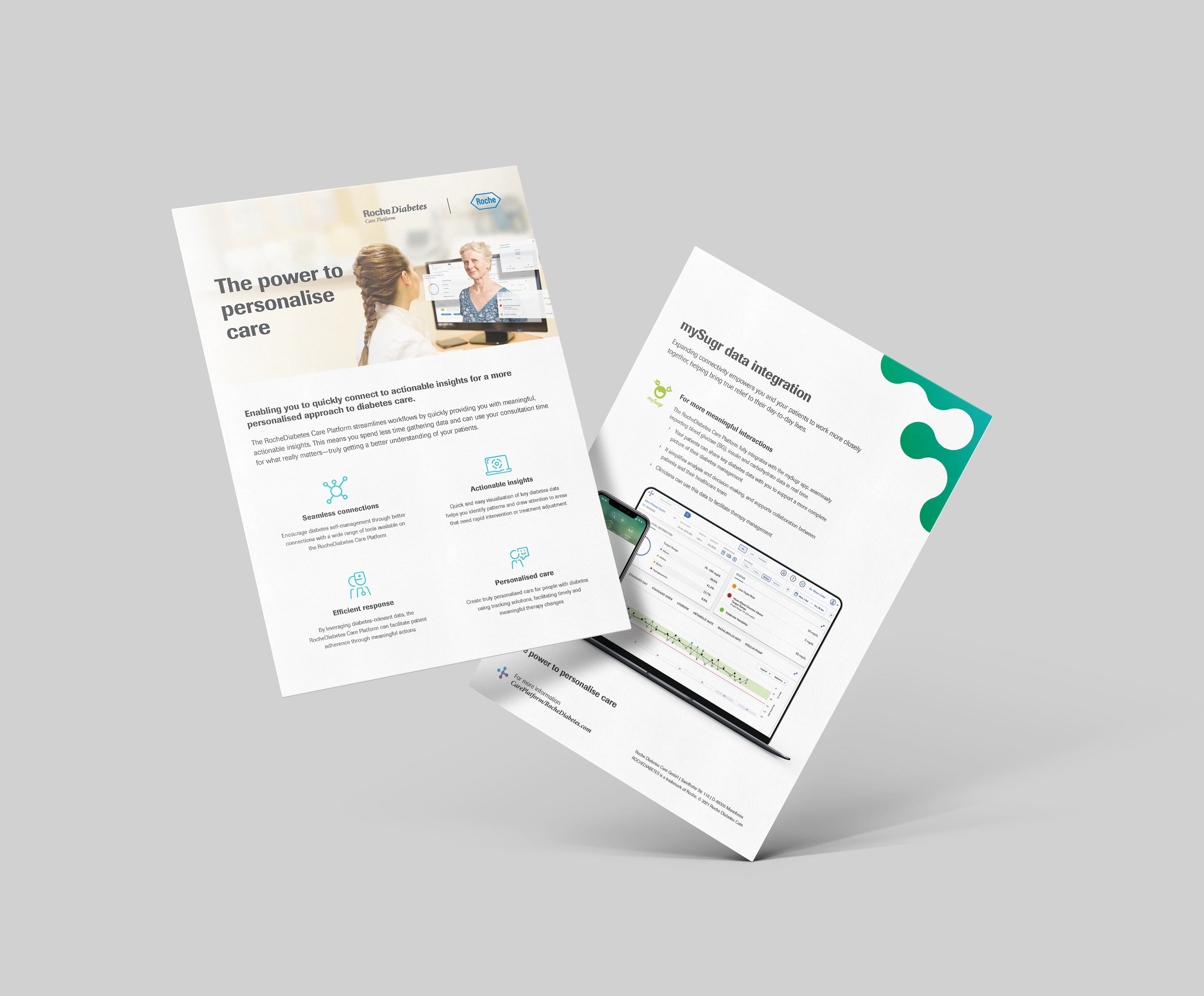 Designed to highlight product features by relating personal patient stories, this compact brochure offers insight into an integrated app and desktop experience. Created as a small but satisfying booklet, the unique brochure uses a double gate-fold design to engage readers. Each spread offers fold-out sections to allow readers to open the flaps to learn more about each patient’s experience.